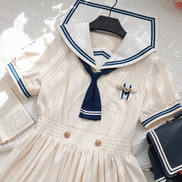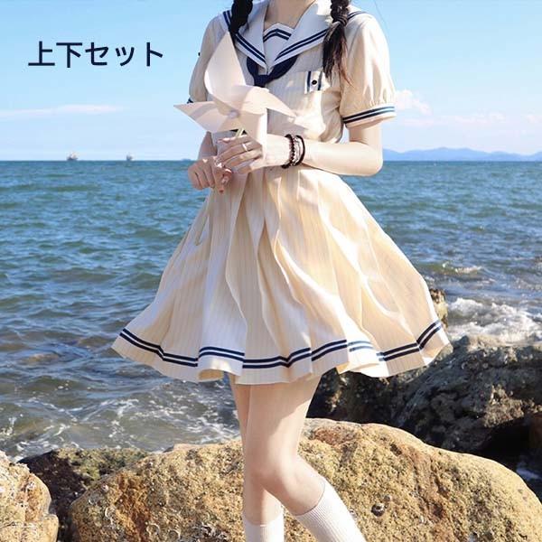 【レビュー投稿で+5%還元】ワンピース ビッグカラー セーラー風 胸元リボン 半袖 夏用 夏服 かわいい レディース デコ襟 大きいサイズ ロリータ ミモレ丈