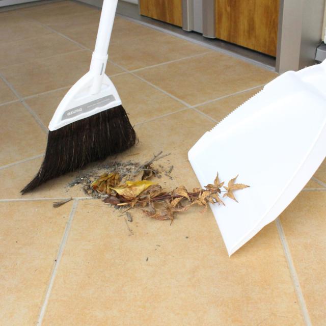 ほうきとちりとりのセットでお手軽に掃除ができます。玄関やベランダなどの掃き掃除に適しています。