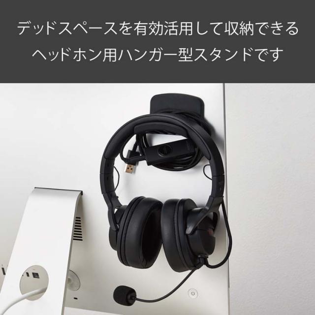 ●ディスプレイの背面などに貼り付け、デッドスペースを有効活用して収納できるヘッドホン用ハンガー型スタンドです。