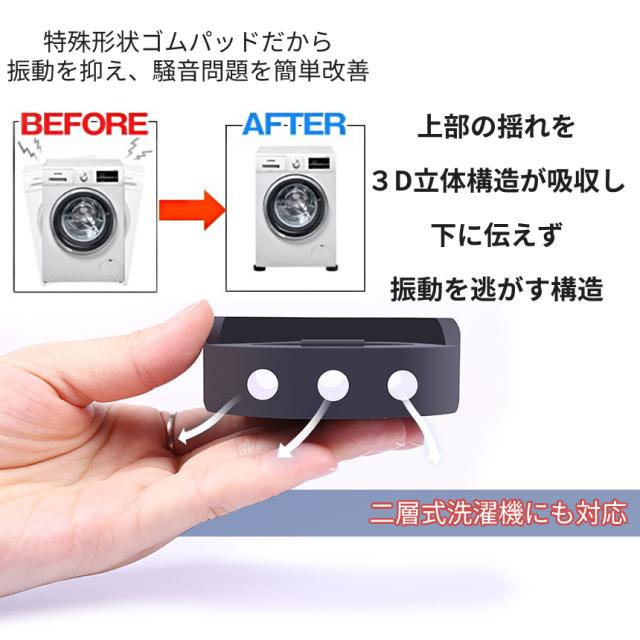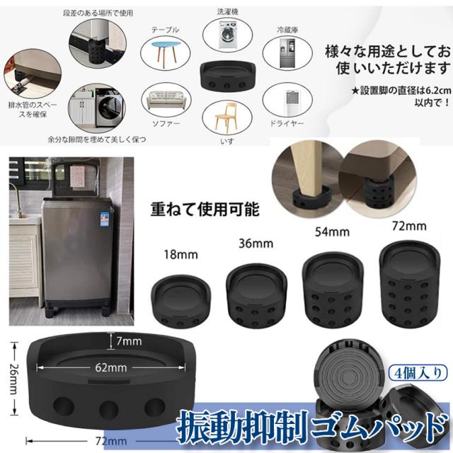 洗濯機 防振 ゴム 振動 吸収 騒音 対策 パッド 4個 セット ドラム式 二層式 かさ上げ 防音 マット 揺れ 防止 抑制 滑り止め 3D 立体 構造 冷蔵庫 ソファー テーブル ベッド 床 傷 キズ 防止 GOMYUREN 送料無料