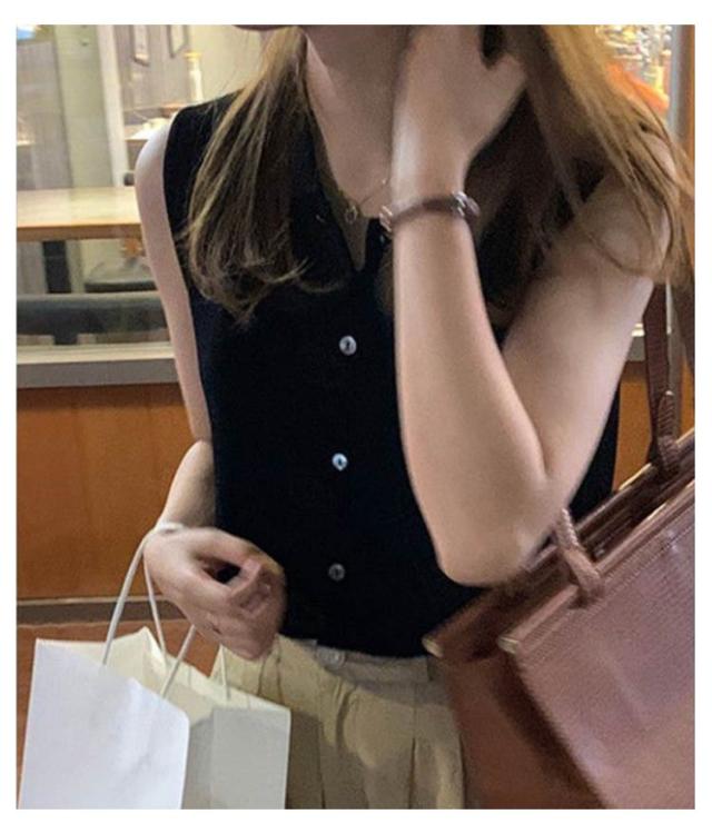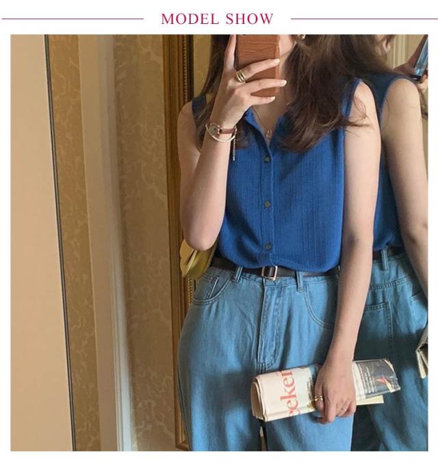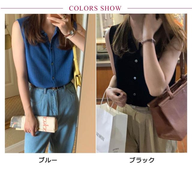 送料無料 薄手 サマーニット ノースリーブ カットソー 襟付き ノースリニット タンクトップ トップス リブニット ボタン 前開き カーディガン レイヤード 無地 ショート丈 きれいめ フェミニン セクシー 体型カバー 夏物