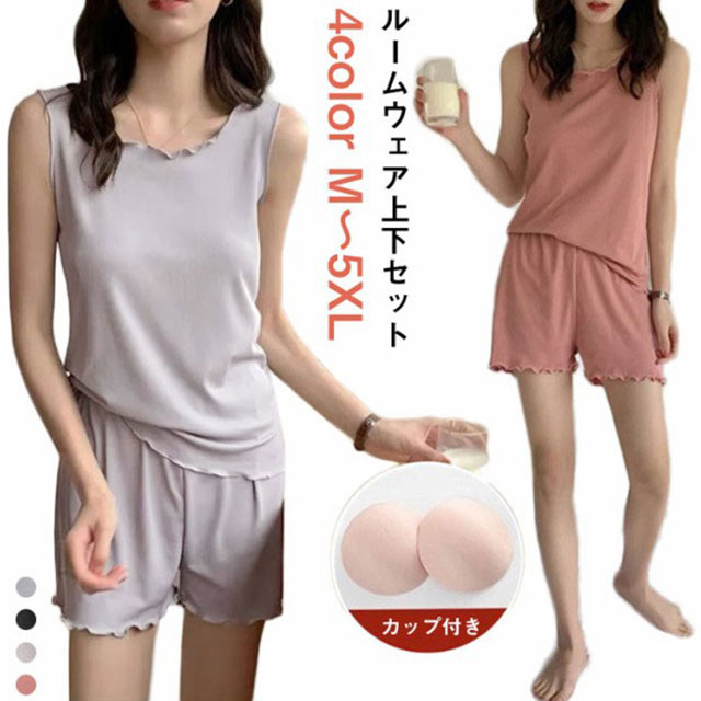 送料無料 ルームウェア レディース フリル パジャマ 上下セット ショートパンツ キャミソール カップ付き セットアップ 下着 夏 可愛い カジュアル 夏用 寝巻 部屋着 寝間着