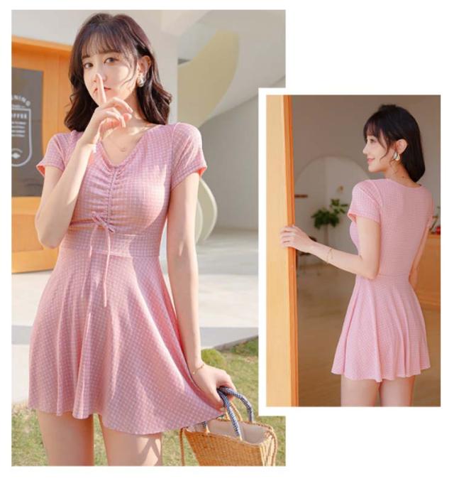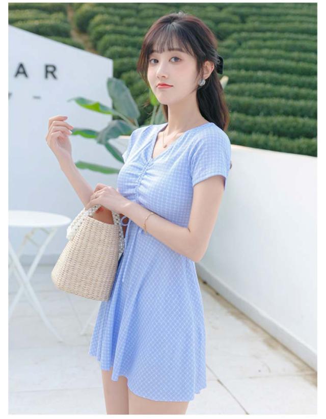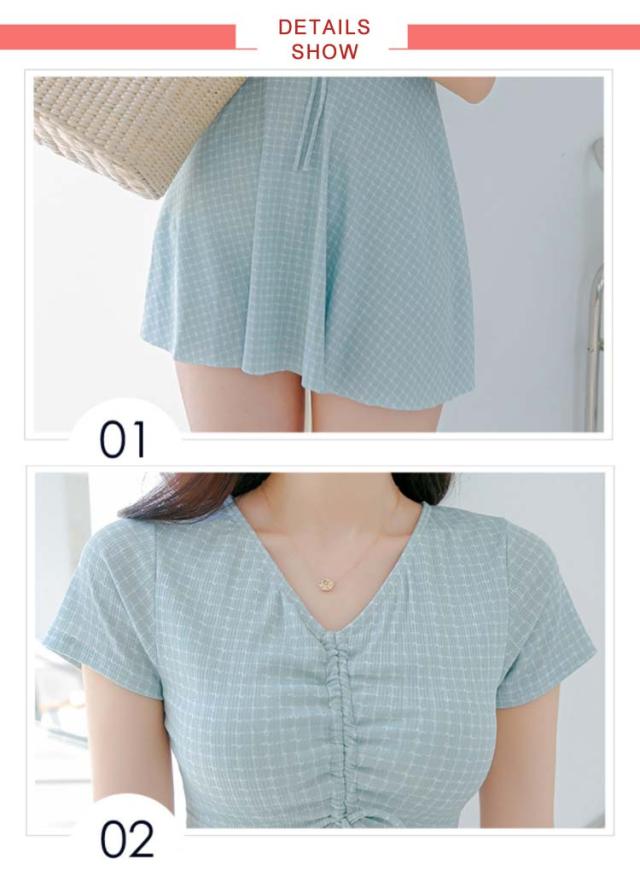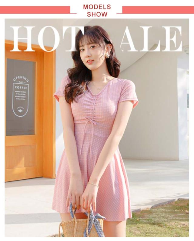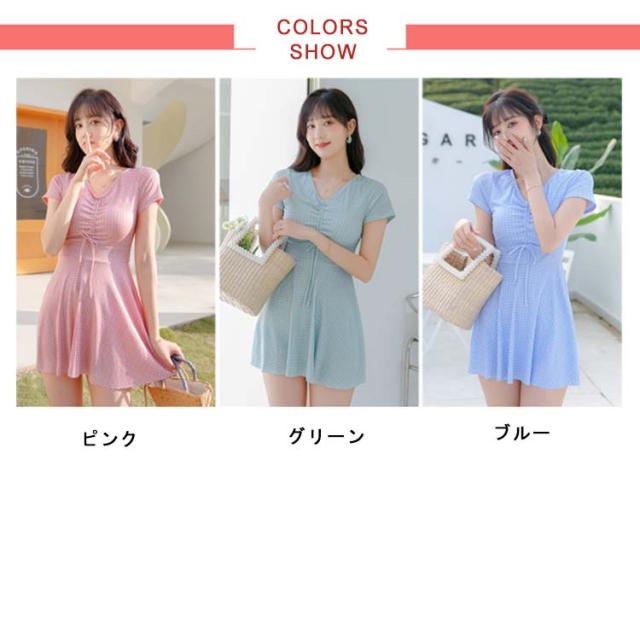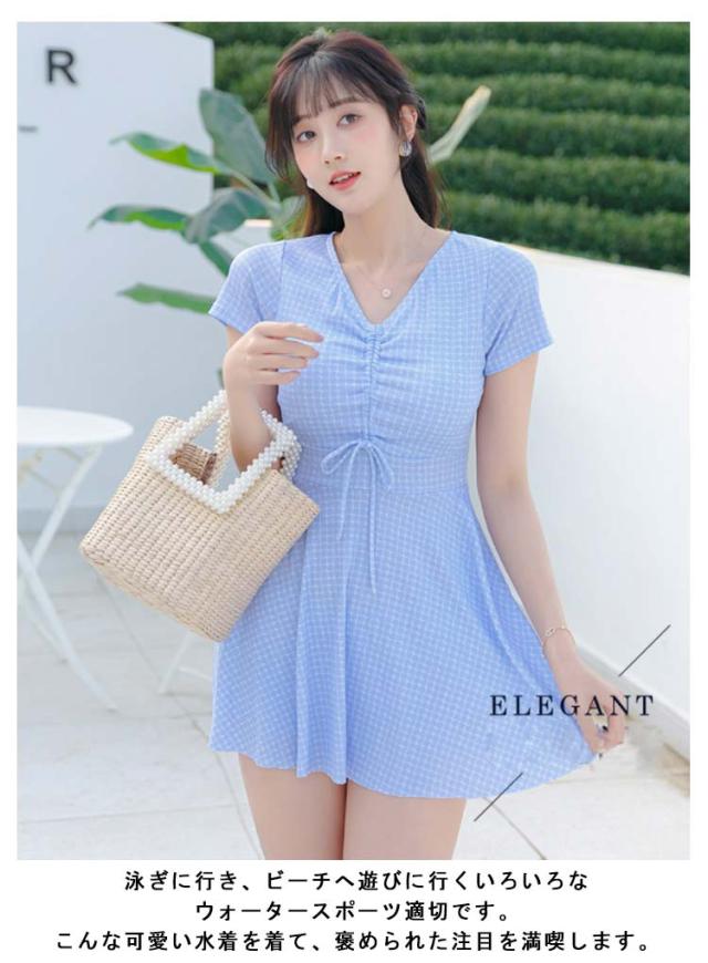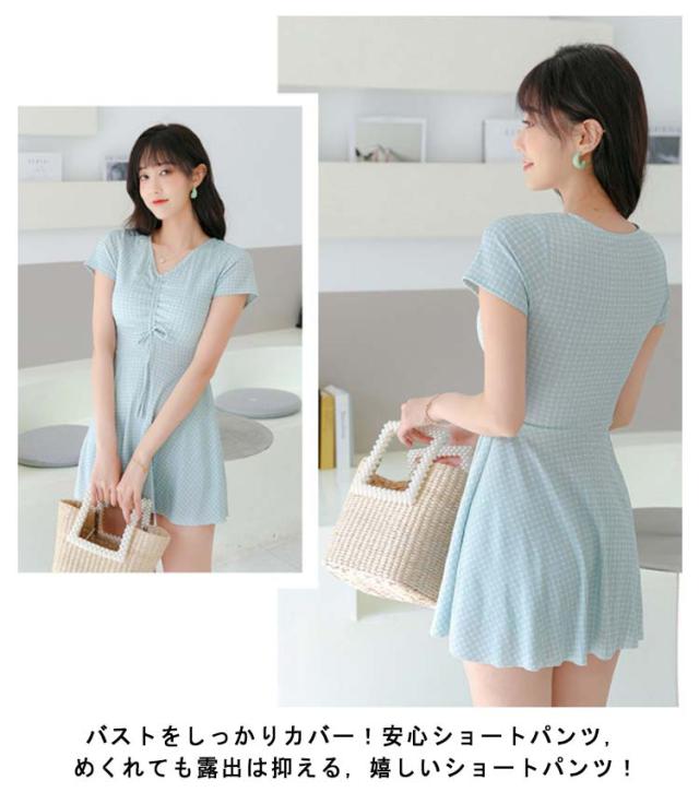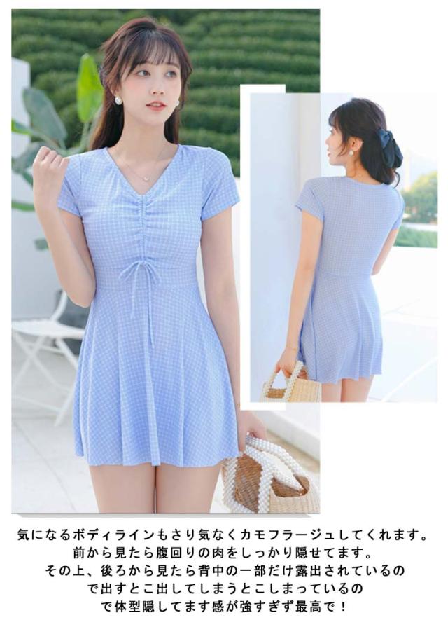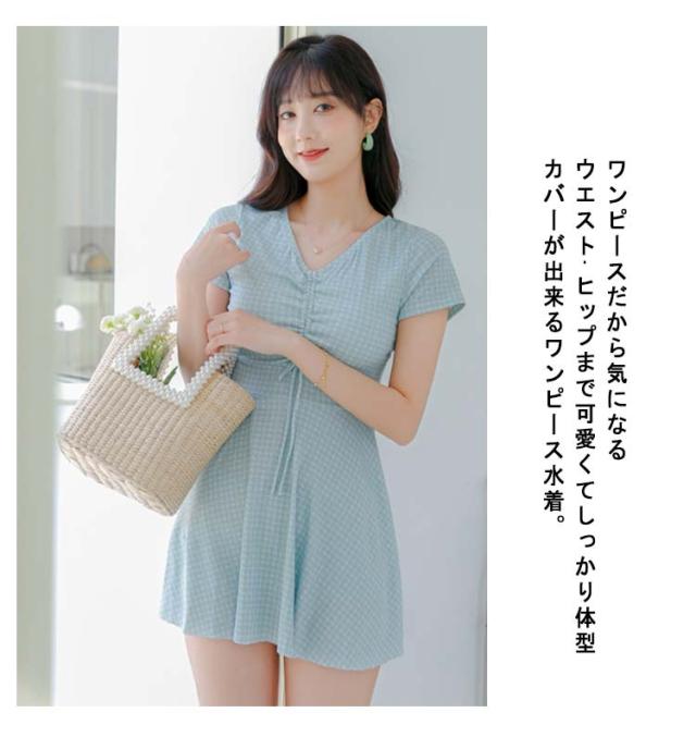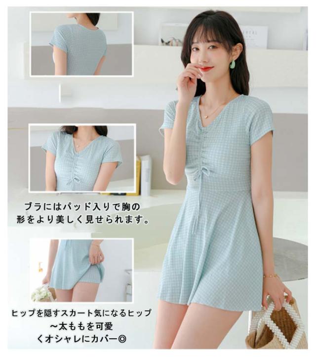 水着 レディース ワンピース 体型カバー 大きいサイズ ぽっちゃり 2点セット かわいい チェック柄 袖 中学生 高校生 露出控えめ Vネック お尻 太もも お腹 カバーアップ 10代 20代 30代 40代 ママ水着 送料無料