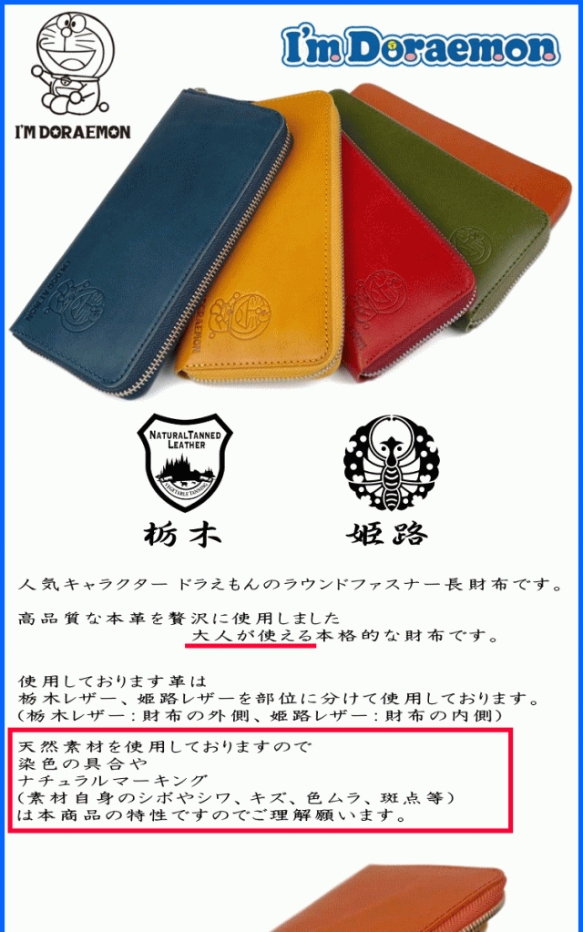 | 備考 | 人気キャラクター ドラえもんの ラウンドファスナー長財布です。 小銭入れあり。 YKK製ファスナー 素材 栃木レザー(外側) 姫路レザー(内側) カード用ポケット数:12 |