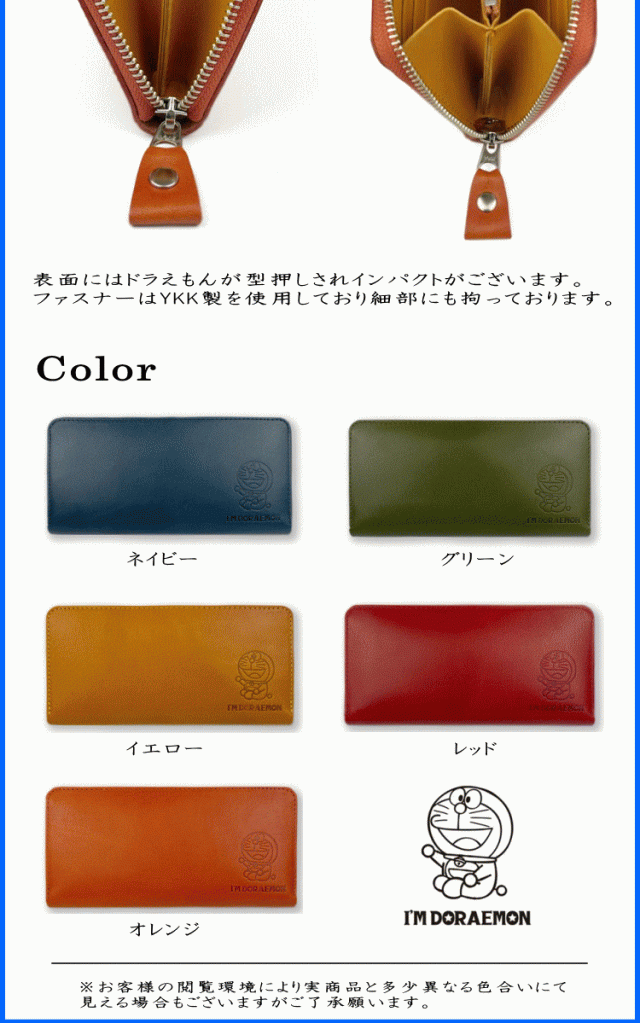 財布 ドラえもん 日本製 栃木レザー 姫路レザー 本革 L字型 ラウンドファスナー 長財布 小銭入れ有り DOR-50 ネイビー色 グリーン色 イエロー色 レッド色 オレンジ色
