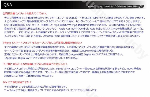 | スバル BRZ(ZD8) & トヨタ GR86(ZN8)専用 USB/HDMIソケット&ケーブルセットです。 純正だと充電のみしか使用できないUSBソケット部を当商品に交換する事で、充電&通信可能なUSB×2系統 + HDMIに変更できます。 純正&社外カーナビからのUSBやHDMIをスマートにアクセス出来る様になります。 グローブBOX等に入っていたUSBケーブル等をセンターコンソールで簡単に接続可能になります。 ナビとHDMI入力可能にする事で、スマートフォンのミラーリングやAmazon Fire TV Stick等が使用可能になり、ナビ画面でのYou Tube視聴やサブスク系の視聴が可能になります。 またApple Car PlayやAndroid AUTO対応ナビ等で有線接続していた場合は今までの煩わしい配線から開放されます。 当商品のケーブル仕様はHDMI Aタイプ 1m及び、USB Aタイプ 0.6m×2本になります。 純正ナビや一部のナビは変換ケーブルが必要になる場合があります。ナビ仕様をご確認の上お買い求め下さい。 商品の取付方法はをご案内しております。ご自身での取付けを検討されている場合は参考にご覧下さい。 社外ナビ等、ナビ配線方法が不明な場合はをご用意していますので、配線方法の参考にして下さい。 「BRZ 純正OPカロッツェリア9インチナビ 別途必要ケーブルリンク」 HDMI D-A変換 CD-HM110互換ケーブル USB増設用 CD-U120互換ケーブル 「GR86 純正OP NSZT-Y68Tナビ 別途必要ケーブル」 HDMI E-A変換ケーブル トヨタ純正ナビ Y6#用USBケーブル 【注意事項】 ・ナビ毎にUSBやHDMIの使用可否や接続方法が異なりますのでナビ仕様をご確認下さい。 ・HDMI入力はナビ毎に入力可能な映像信号が決まっています。HDMI入力機器がナビ側映像信号とマッチする必要があります。 ・ナビによってはナビ裏からUSBケーブルがない場合等、ケーブルが届かない場合は別途延長のケーブルが必要になる場合があります。 ・当社ではHDMI入力機器等との接続使用によるマッチングの保証は出来かねます。 ・動画等の再生はお客様の責任にて駐車中のみご視聴ください。 |