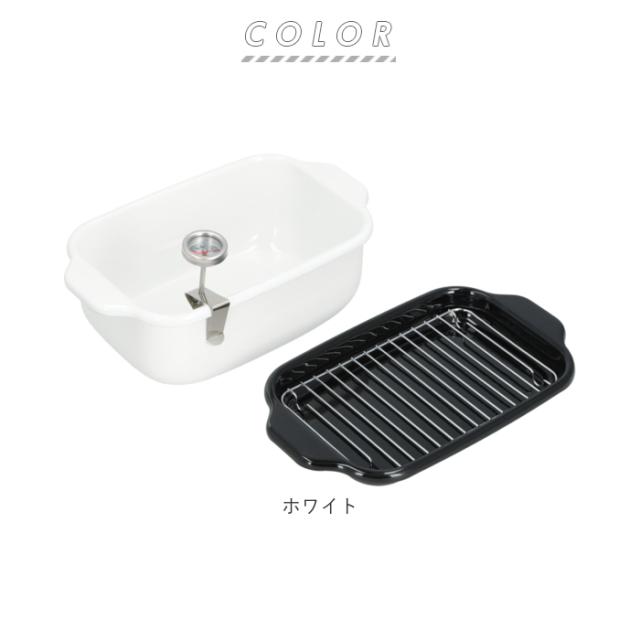 | 素材 | [鍋]スチール(フッ素樹脂加工) [スノコ]鉄クロムメッキ塗装 ※[付属品]バット、スノコ網、温度計、取扱説明書 |