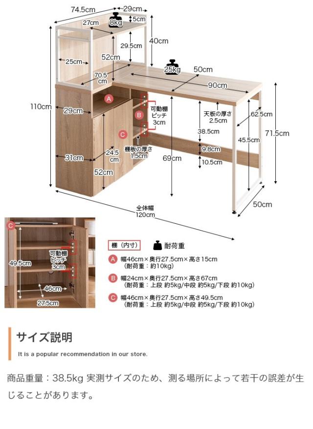 天板:約25kg、棚(最上段):約8kg、棚(天板下):約10kg、扉収納(可動棚):約5kg、扉収納(底板):約10kg、オープン収納(可動棚):約5kg、オープン収納(底板):約10kg