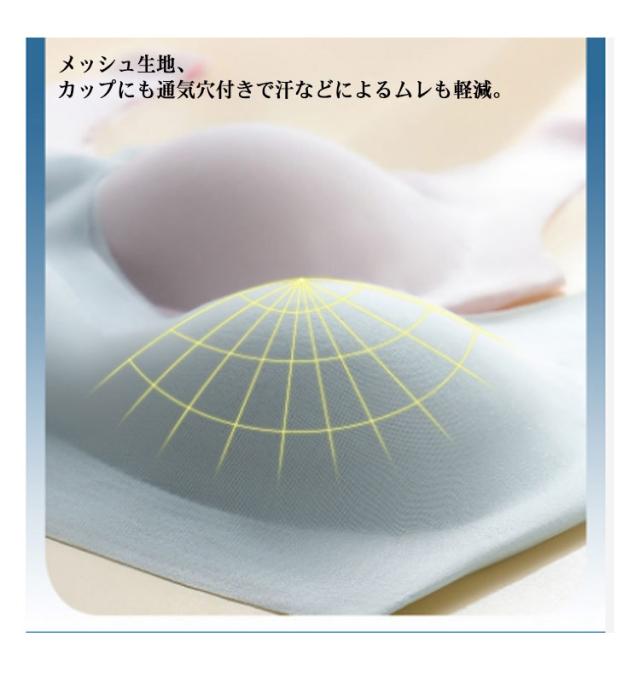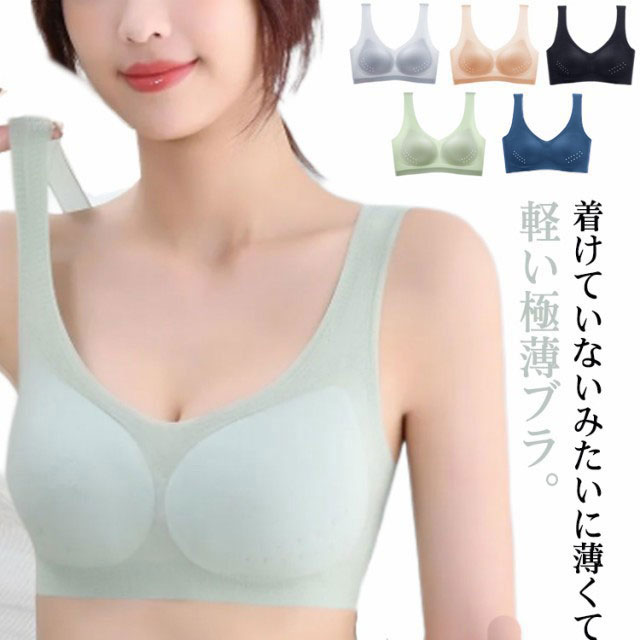 | 着けていないみたいに薄くて軽い極薄ブラ。 縫い目がほぼないシームレス設計ながら、ほどよい締め付け感でしっかりホールド。 脇への横流れを防止し、胸を立体的に綺麗に魅せます。 メッシュ生地、カップにも通気穴付きで汗などによるムレも軽減。 接触冷感の素材がひんやり気持ちよく、さらっとした肌触りが暑い日にぴったりです。 幅広ショルダーでズレ落ちにくく肩に負担が掛かりにくく快適です! ズレにくく、着るだけでメリハリがつきますので、昼も夜も着用して頂けます☆ | |