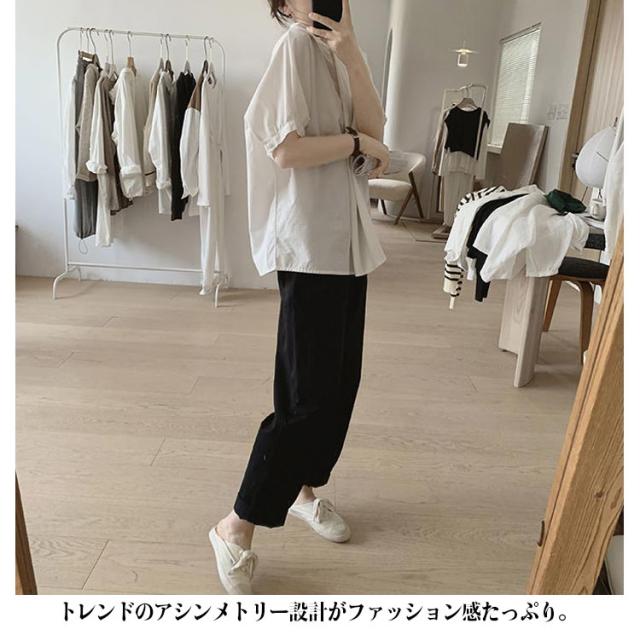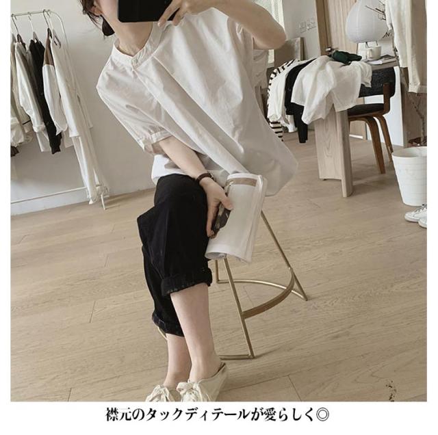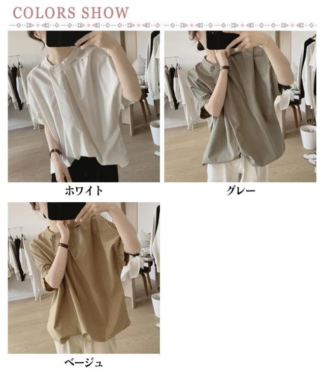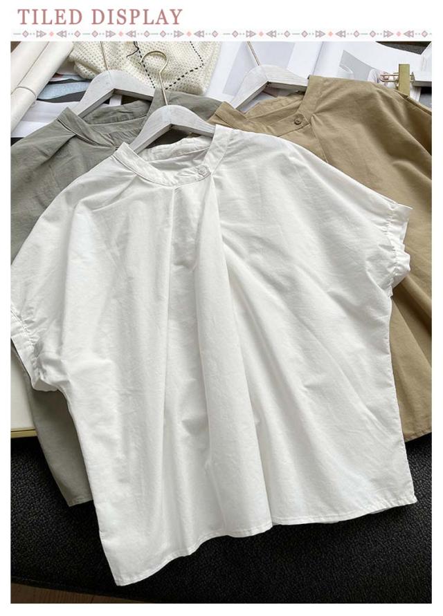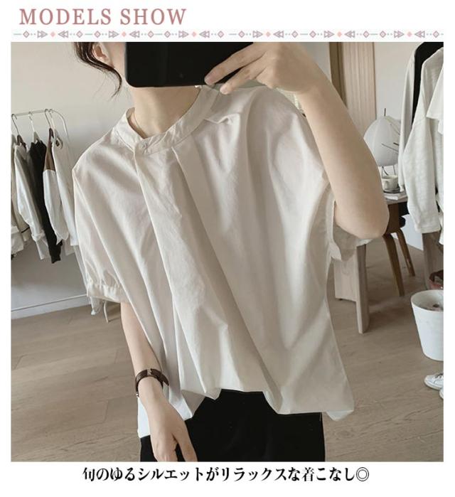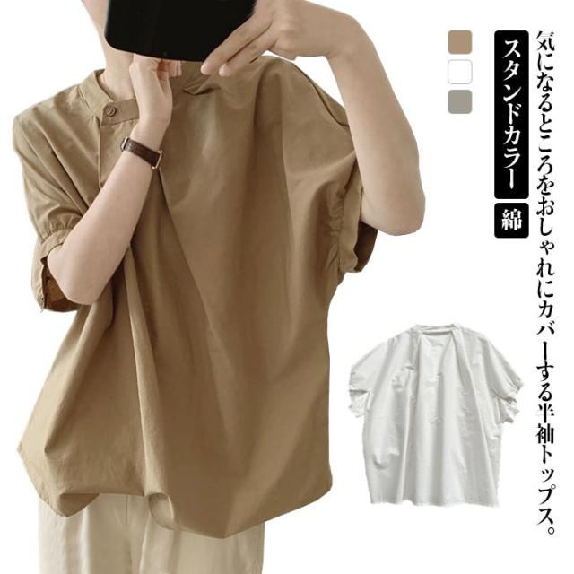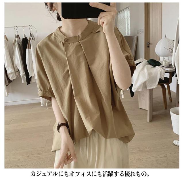 ドルマン袖 トップス 半袖 ブラウス シャツ レディース 送料無料 スタンドカラー プルオーバー タック 綿 韓国ファッション
