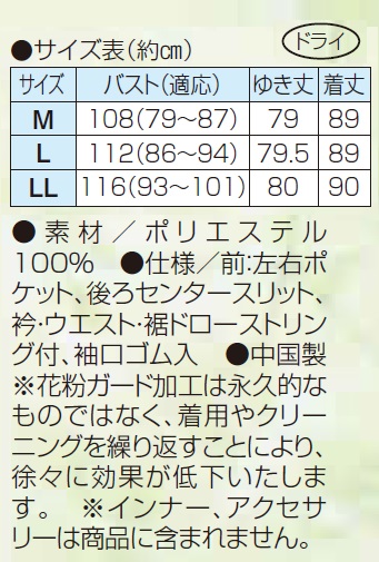 ※花粉ガード加工は永久的なものではなく、着用やクリーニングを繰り返すことにより、徐々に効果が低下いたします。