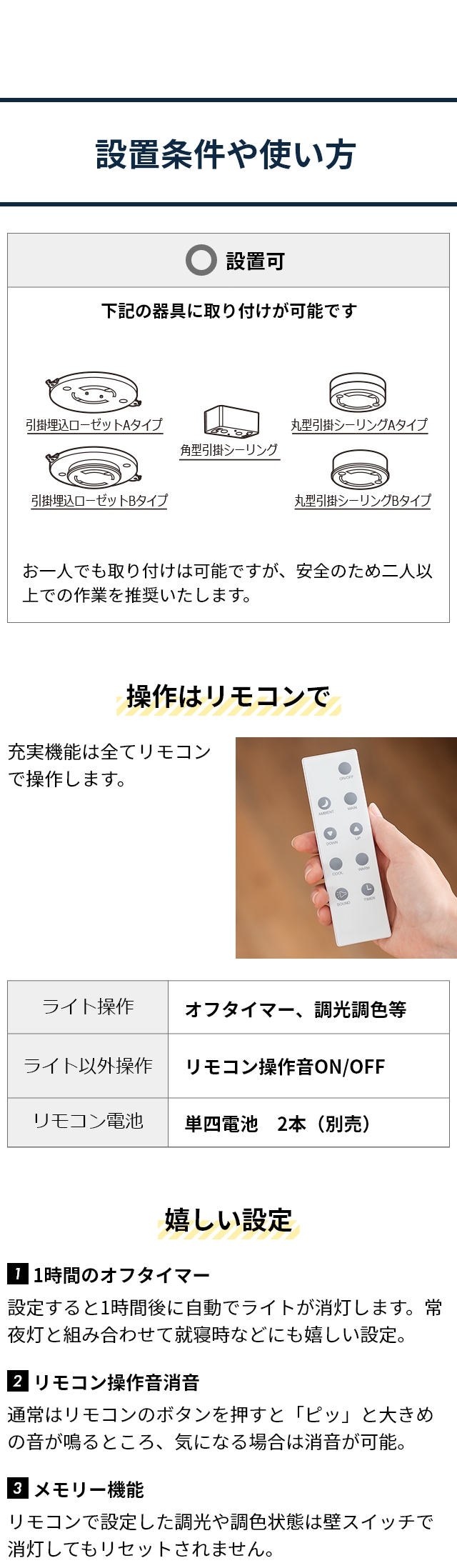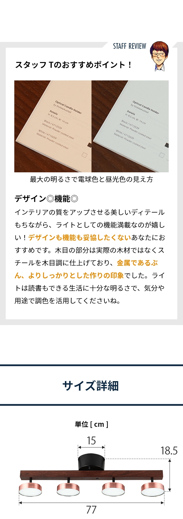 | ●サイズ 幅77×高さ18.5×奥行き15(cm) ●重量 2.6kg ●材質 樹脂、アルミ、スチール ●電源 AC100V、50/60Hz ●光源 LED ●消費電力 [主照明]5~46W [常夜灯]0.9~2.6W ●器具光束 [主照明]500~4800lm [常夜灯]70~200lm ●色温度 [主照明]2700~6500K [常夜灯]2700K ●演色性 [主照明]85Ra [常夜灯]85Ra ●動作温度 -1035℃ ●保証期間 1年 |