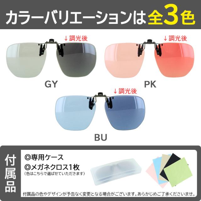 | ●レンズカラー GY グレー調光偏光 PK ピンク調光偏光 BU ブルー調光※偏光ではありません ●金具カラー(全カラー共通) ガンメタル | ●素材 レンズ:プラスチック(調光偏光) 金具:メタル合金 ●仕様 跳ね上げ クリップタイプ ●可視光線透過率 グレー調光偏光 調光前40%−調光後13% ピンク調光偏光 調光前65%−調光後45% ブルー調光 調光前41%−調光後17% |