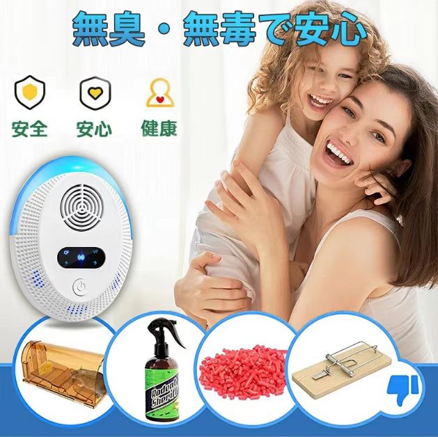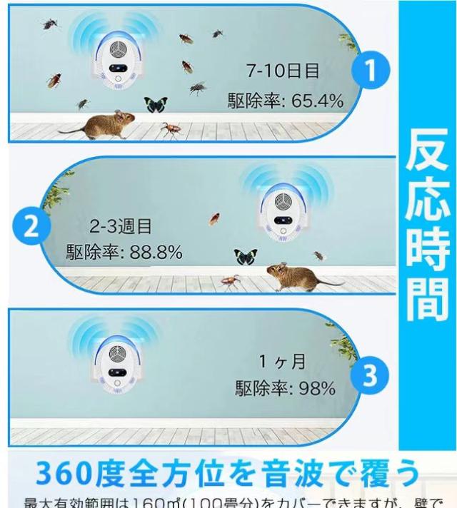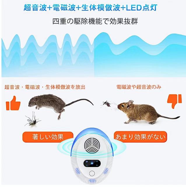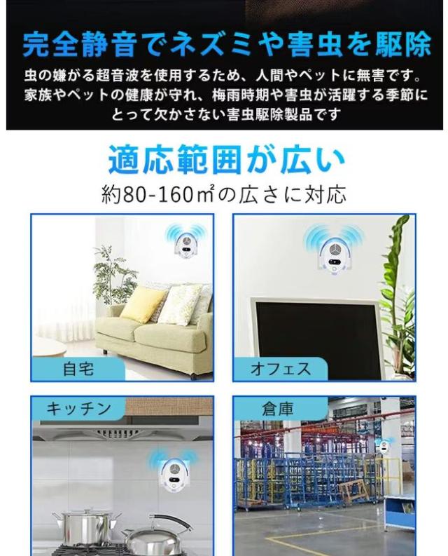 【ねずみ駆除 超音波 強力】ネズミやゴキブリなどが嫌がる超音波を利用して、25-85HZの周波数が自動的に変換できます。有効範囲は80-120平方メートルです。ネズミ、コウモリ、ゴキブリ、蚊、アリ、ノミの駆除に非常に効果的です。