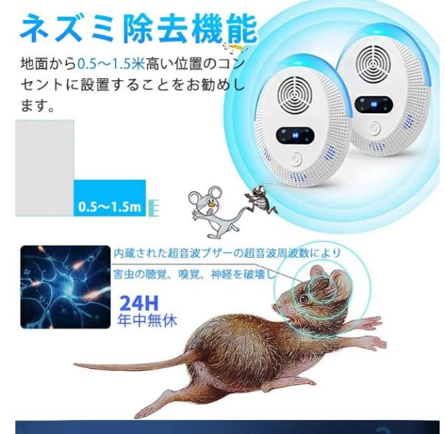 - リビングで 紙を噛む様な音がして ネズミか何かいるのかと思い 超音波が良いと聞いた事があったのでコチラの2個セットにつられ購入しました。発送も早くポスト配達でしたが何の問題も無し 早速コンセントに繋げ...