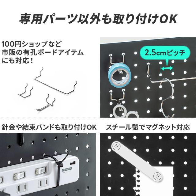 ●結束バンドや市販の2.5cmピッチ用の有孔ボードアイテム、スチール製でマグネットにも対応します。