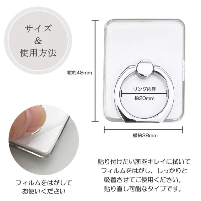 スマホリングの透明フィルムを剥がしてから、スマホの背面に押さえながら強めに圧着してください。