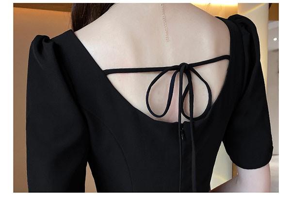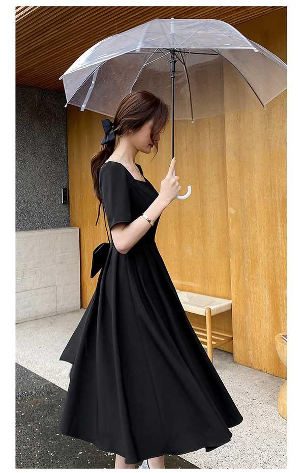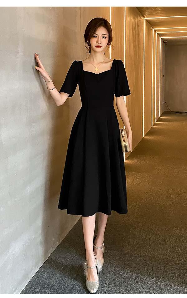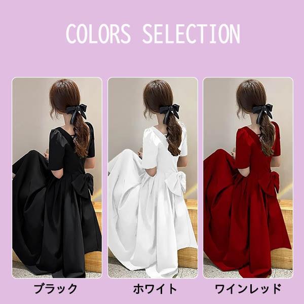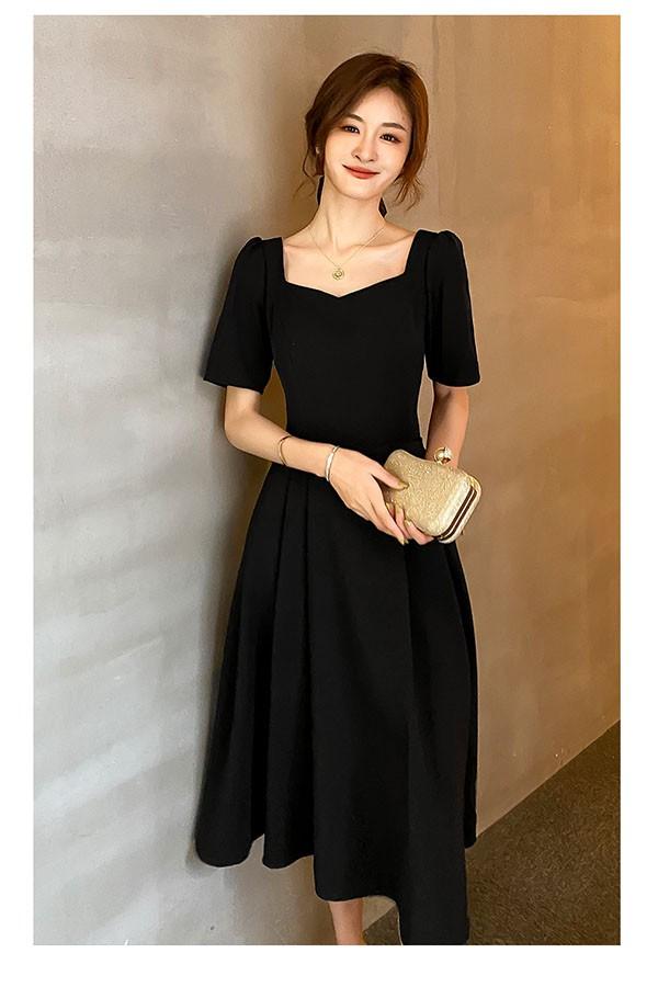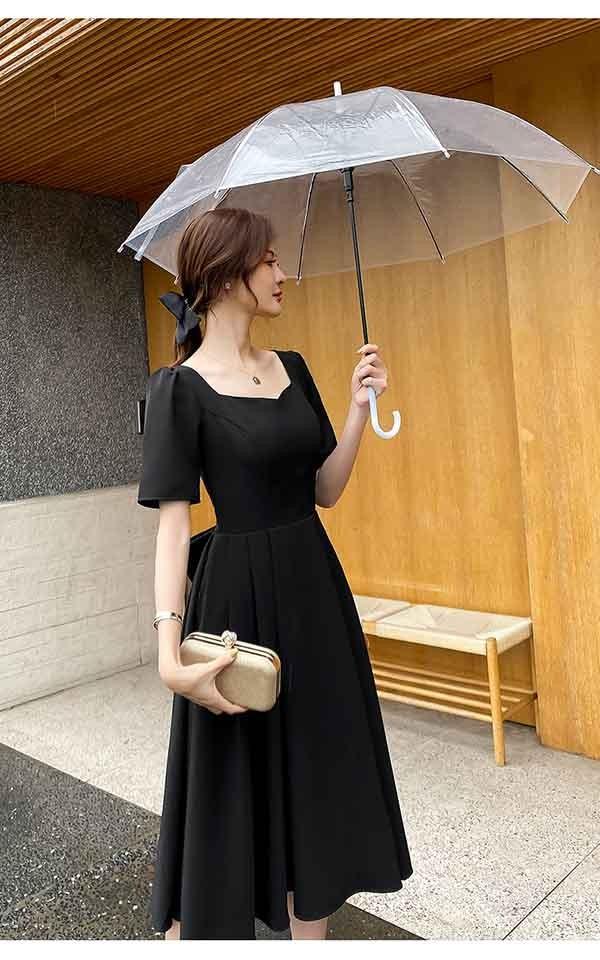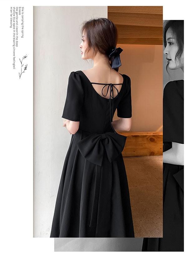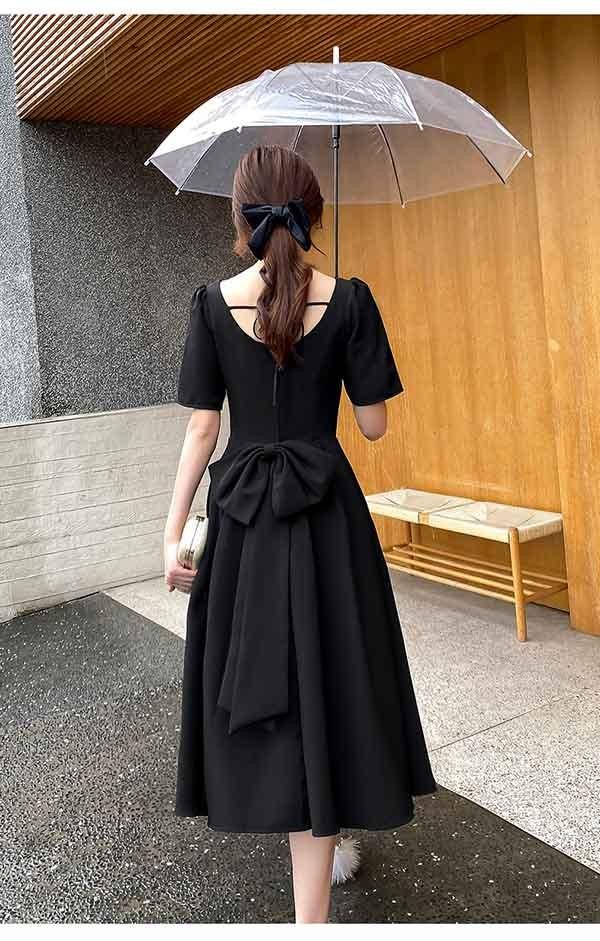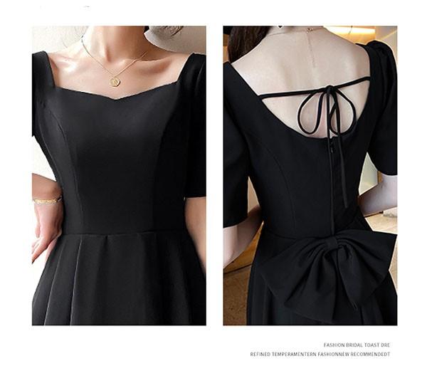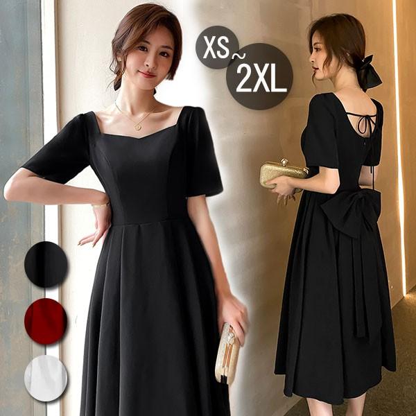 ドレス ミモレ丈 大人 ピアノ 発表会 ドレス 演奏会 ミディアムドレス 袖あり 背中開き スクエアネック サテン パーディードレス Aライン 後ろリボン フォーマル 小さいサイズ ファスナー 可愛い 女子会 結婚式 母親 ドレス ブラック 黒 XS S M L XL 2XL da121x1x1la