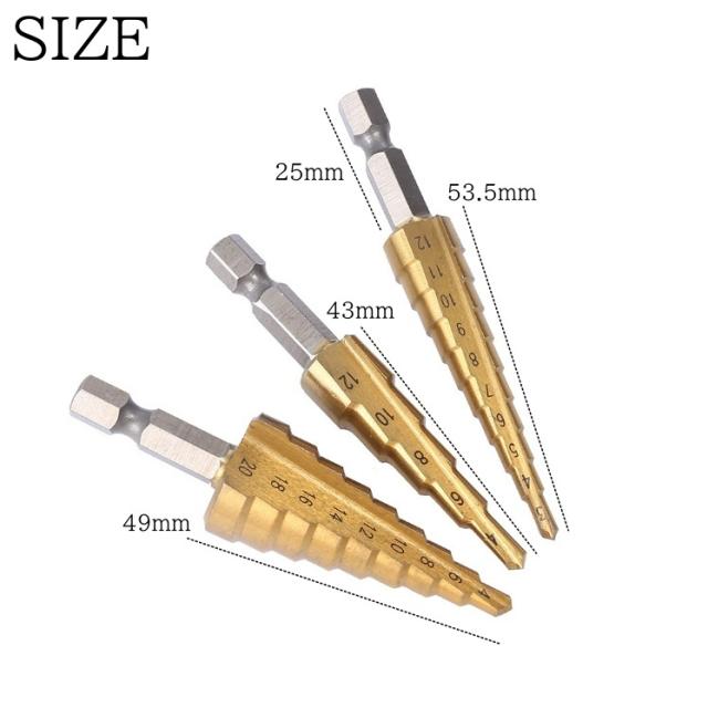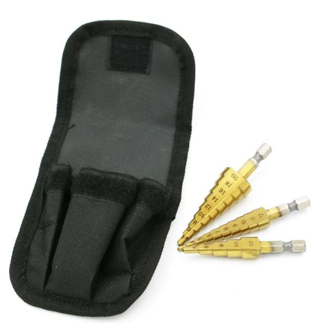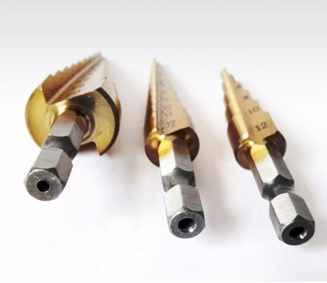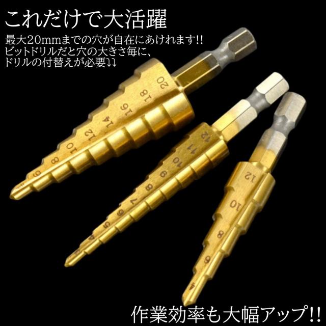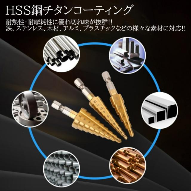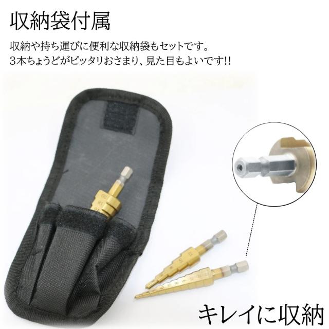 ステップドリル ドリルビット スパイラルドリル 3本セット チタンコーティング HSS 穴あけ 六角軸 収納袋付き