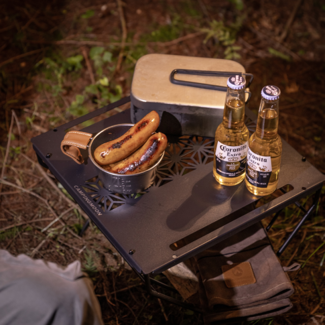 ワンタッチで設置できる別売の天板を使えば、お皿や水気等が出るクーラーボックス等を置いたりできるアウトドアテーブルとして利用できます。 たき火タイムに、マグやグラスを置くのに便利です。