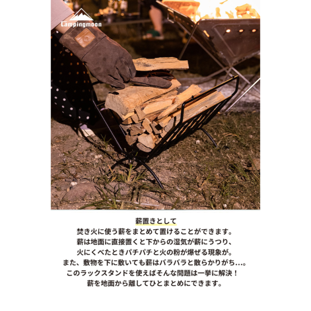 ■薪置きとして■焚き火に使う薪をまとめて置けることができます。薪は地面に直接置くと下からの湿気が薪にうつり、火にくべたときパチパチと火の粉が爆ぜる現象があります。また、敷物を下に敷いても薪はバラバラと散らかりがち…。