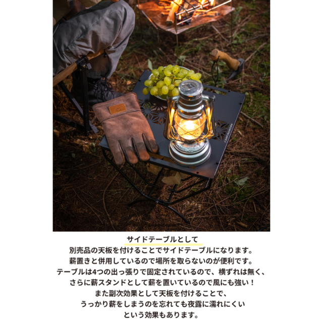 ■ファイヤーサイドテーブルとして(別売品)■別売の天板を付けることでサイドテーブルになります。薪置きと併用しているので場所を取らないのが便利です。