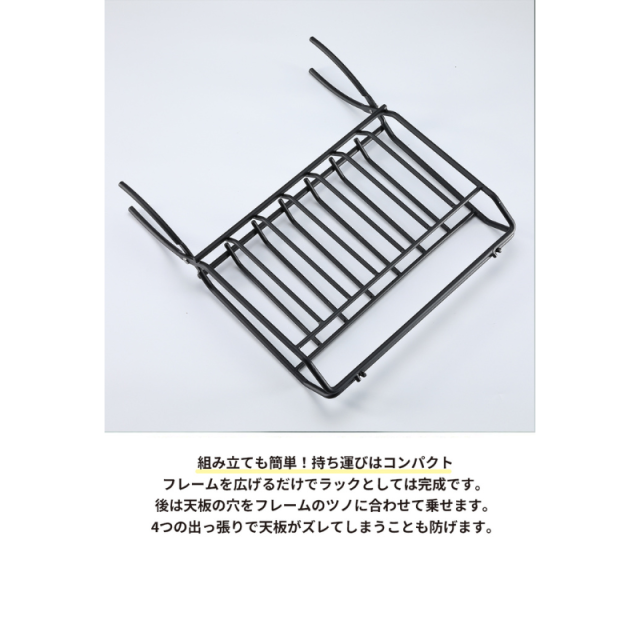 ■組み立ても簡単!持ち運びはコンパクト■フレームを広げるだけでラックとしては完成です。後は天板の穴をフレームのツノに合わせて乗せます。4箇所の出っ張りで天板がズレてしまうことも防げます。