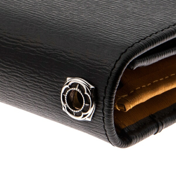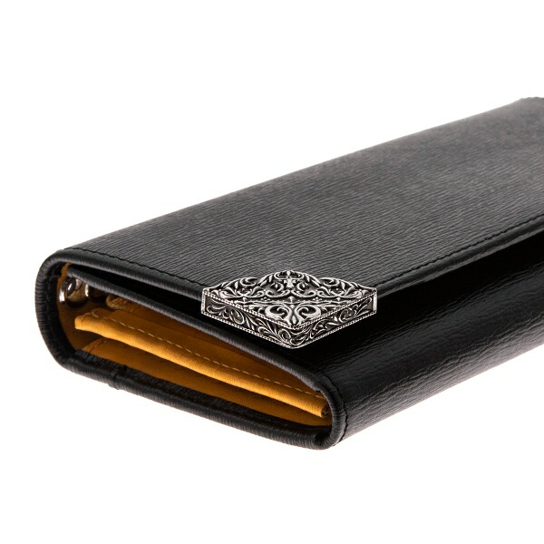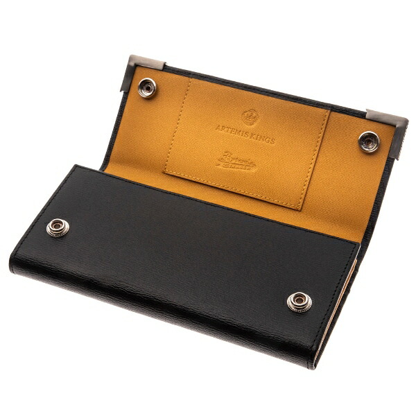 アルテミスクラシックとキングスのダブルネーム財布。型押しブラック本革製、フタ式ロングウォレット。