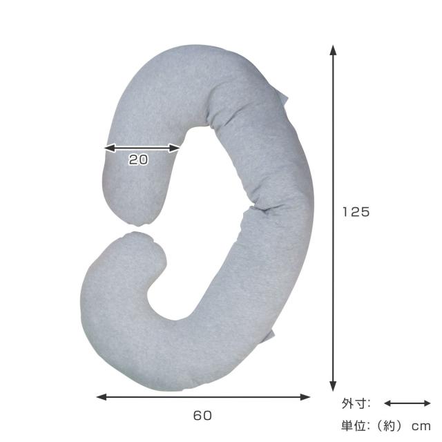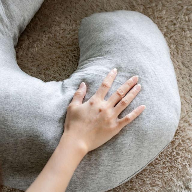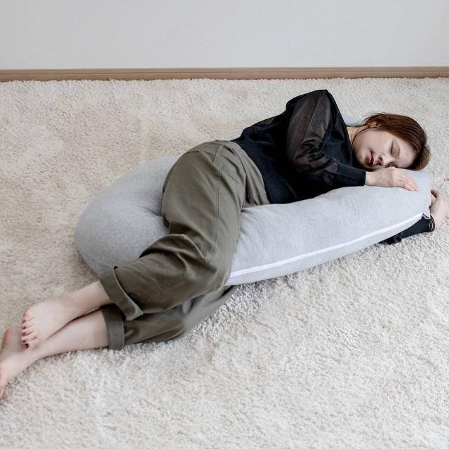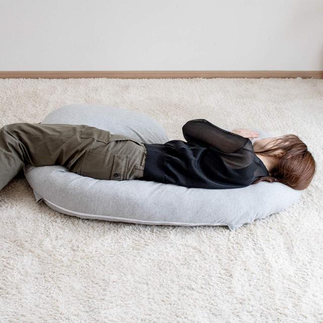 C型で長めの作りなので、妊娠中でもリラックスして睡眠がとれる横向きの寝姿勢(シムスの体位)をラクにキープできます。背中や腰がサポートされるので、優しく包み込まれているような安心感で眠ることができます。妊娠中だけでなく、快適な横向き寝がしたいすべての方におすすめの抱き枕です。