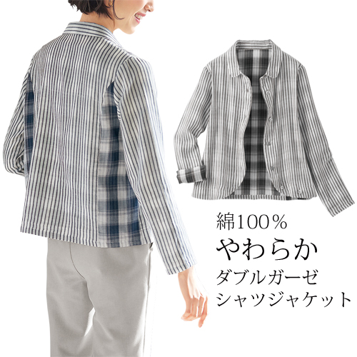 綿100%ダブルガーゼ シャツジャケット ネイビー系 ストライプ柄 上着 レディース 婦人服 ミセス シニア 女性 チェック柄 裏地 オシャレ シニアファッション 50代 60代 70代 80代 母の日 お母さん サマージャケット コットン素材