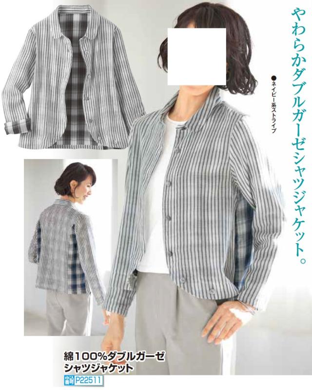 シャツジャケット レディース ネイビー コットン 綿100% ダブルガーゼ ストライプ柄 上着 婦人服 ミセス シニア 女性 チェック柄 裏地 オシャレ 綿素材 シニアファッション 40代 50代 60代 70代 80代 母の日 お母さん サマージャケット コットン素材 春夏 nss p22511