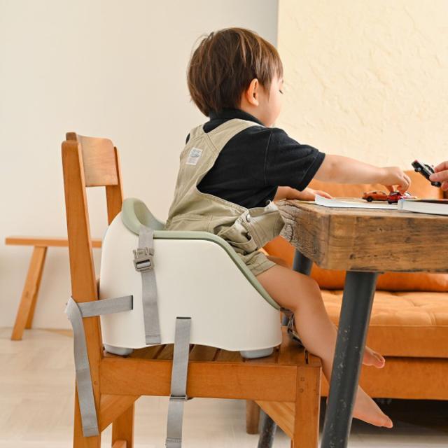 床の上で座ったり、テーブルで家族一緒に食事したりと家中どこでも使える万能チェアです。本体は約2kgと軽く、背面に取っ手がついているので、持ち運びもらくらくです。