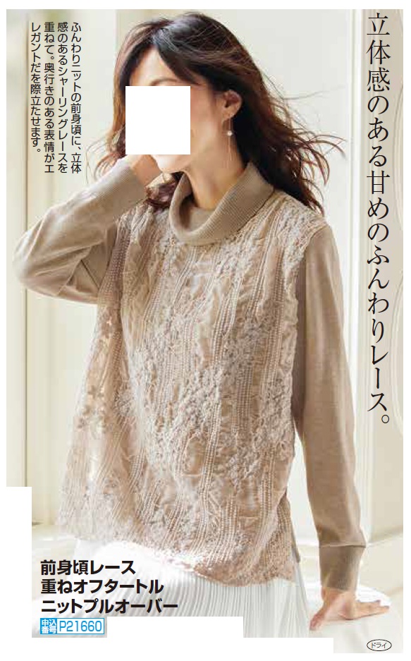 前身頃レース重ねオフタートルニットプルオーバー ベージュ系 タートルネック 長袖 レディース 婦人服 ミセス シニア 女性 かわいい フェミニン 上品 とっくり ハイネック シニアファッション 50代 60代 70代 80代 母の日 ギフト プレゼント 敬老の日 ギフト プレゼント