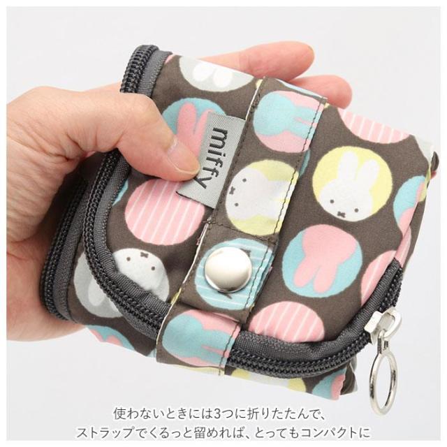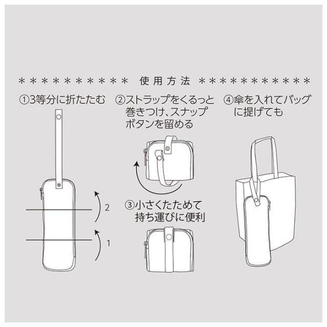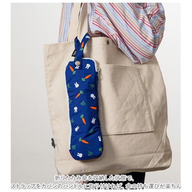 すっぽり包み込んで、しっかり吸水!ミッフィーちゃんの折りたたみ傘ケース。開口部のファスナーがL字型に大きく開いて、濡れた折りたたみ傘をすっぽり収納。手荷物が増えず、カバンの中も濡らさない優秀アイテム。ケース内側のふわふわマイクロファイバー素材が、濡れた傘生地の水滴をグングン吸収。(※完全防水仕様ではありません。傘生地が大量の水を含んでいる場合など、水漏れをする場合があります。)全長26cm、折りたたみ時の周囲約19cm程度までの、様々な折りたたみ傘のサイズに対応。使わないときには3つに折りたたんで、ストラップでくるっと留めれば、とってもコンパクトに。折りたたみ傘を収納した状態で、ストラップをカバンのハンドルに取り付けると、傘の持ち運びが楽ちん。折りたたみ傘の収納だけでなく、結露で汗をかいた500mlペットボトル用のポーチにも使えて便利。(※ペットボトルの形状によっては、収納できない場合がございます。)ミッフィーちゃんをモチーフにした、個性的なテキスタイルデザインが魅力。ミッフィーちゃんがケースの生地のどこに隠れているか、探してみてね。