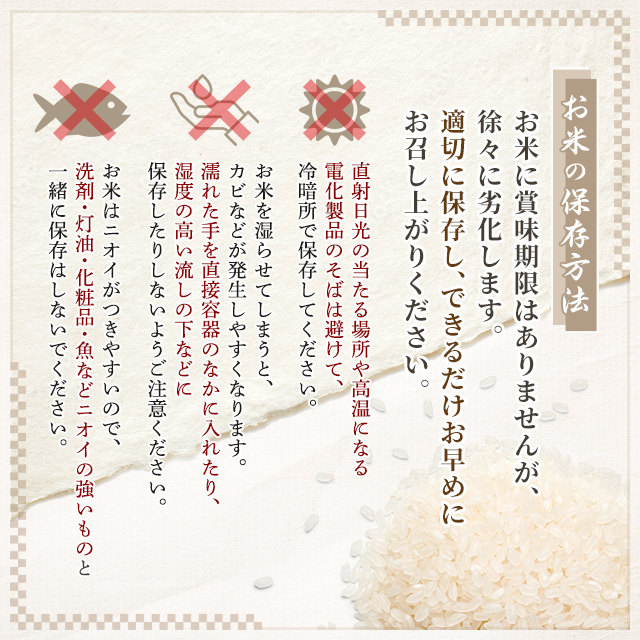 ・お米に賞味期限はありませんが、徐々に劣化(酸化→古米化→食味低下)します。到着後はお早めにお召し上がりください。