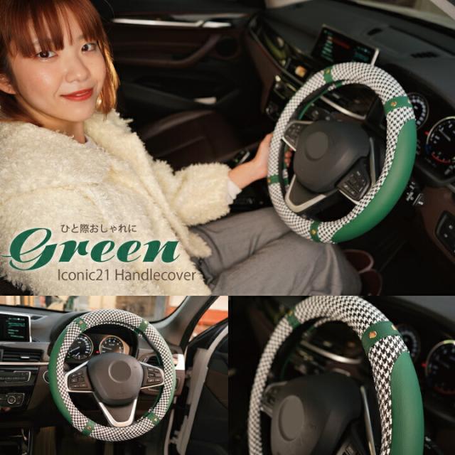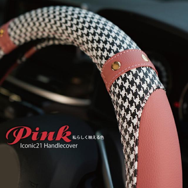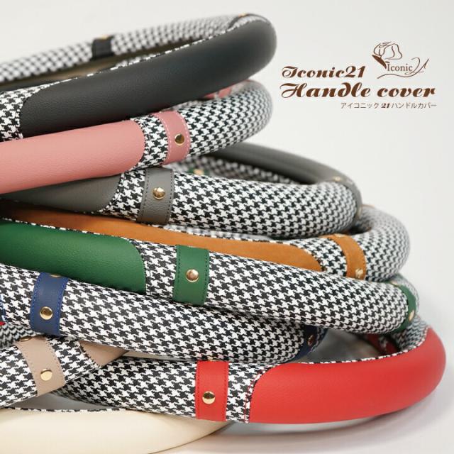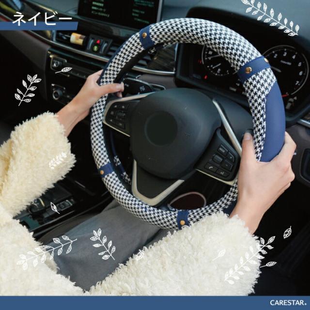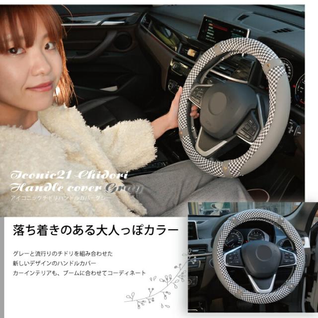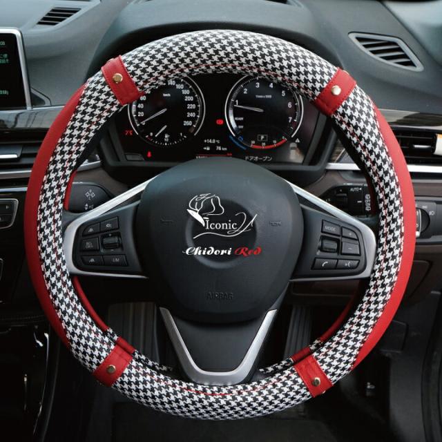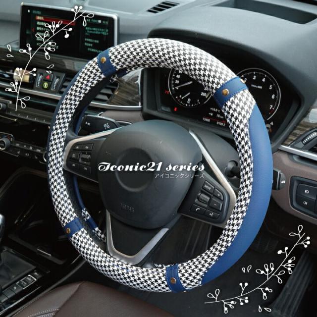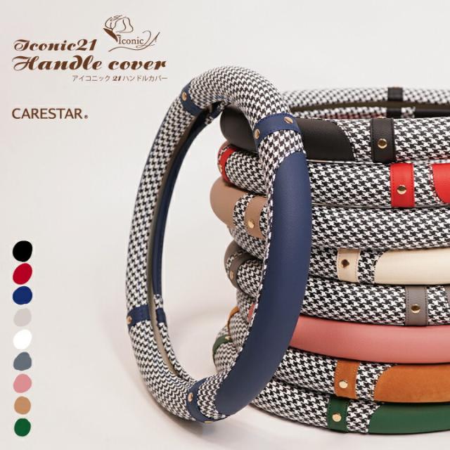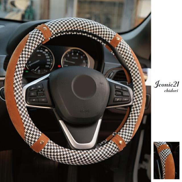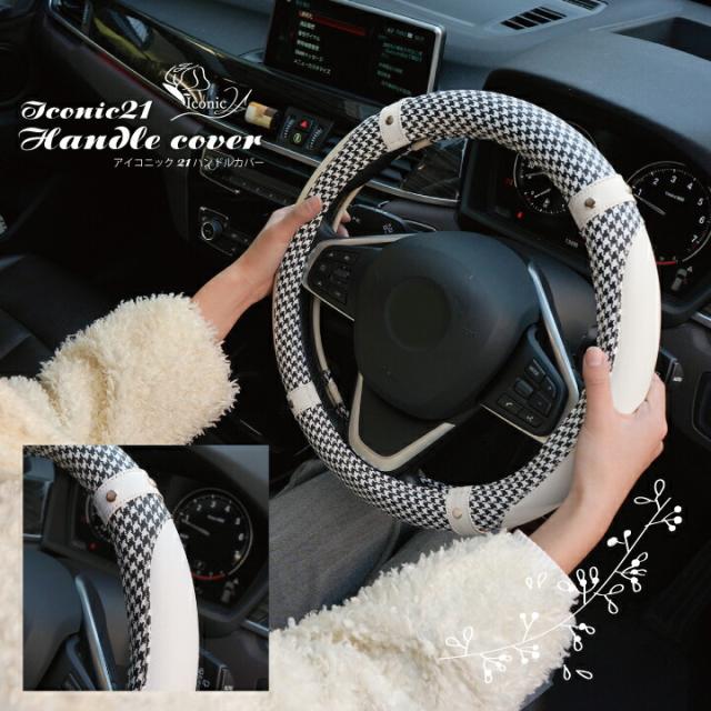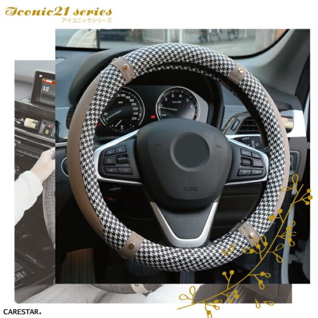 ハンドルカバー チドリ柄 アイコニック21 ステアリングカバー Sサイズ 千鳥格子 普通車 ミニバン 軽自動車 適合 ハンドル カバー O型 モノトーン チェック おしゃれ かわいい 内装パーツ カー インテリア ケアスター CARESTAR