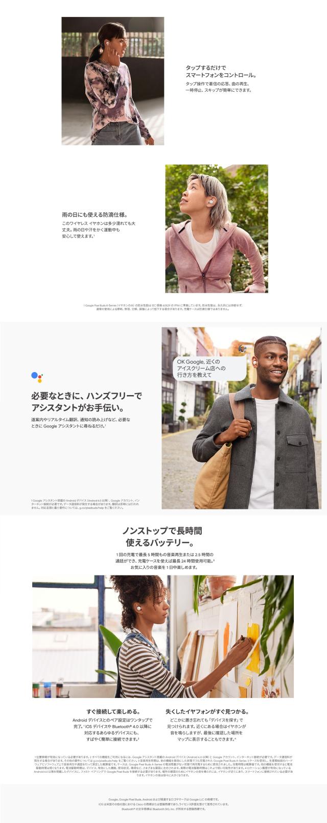 ※Google Pixel Buds A-Series の防水性能は IEC 規格 60529 の IPX4 に準拠しています。防水性能は永久的には持続せず、通常の使用による摩損、修理、分解、損傷によって低下する場合があります。充電ケースは防滴仕様ではありません。Google Pixel Buds の防水性能は IEC 規格 60529 の IPX4 に準拠しています。防水性能は、永久的には持続せず、通常の使用による摩耗、修理、分解、損傷によって低下する場合があります。接続 左右の各イヤホン