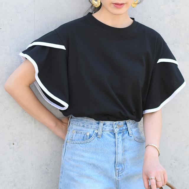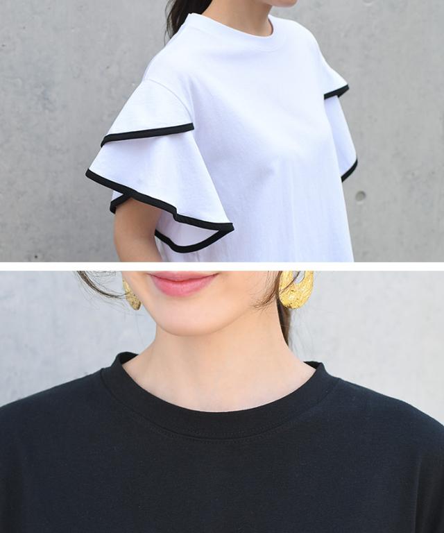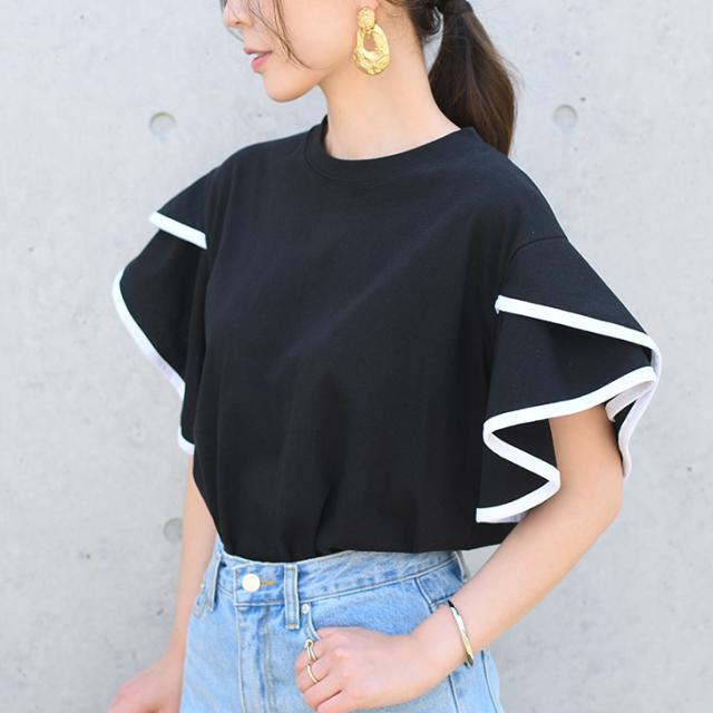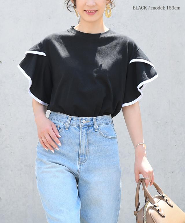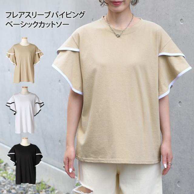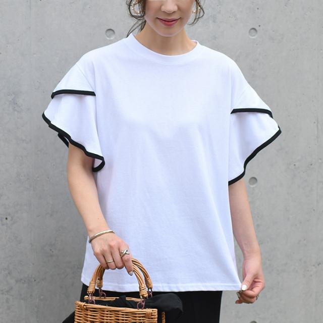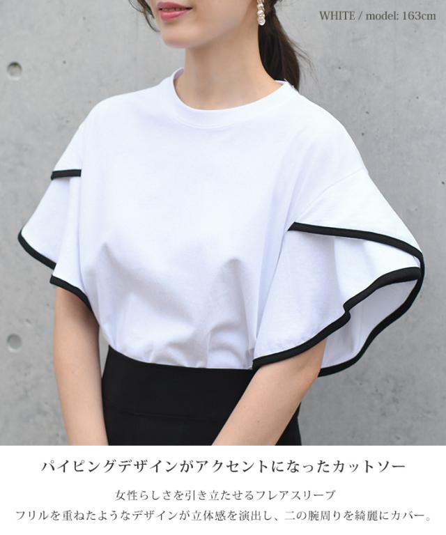 新作 フレアスリーブパイピングベーシックカットソー レディース トップス 半袖 コットン 綿 夏 涼しい バイカラー 配色 フリル かわいい おしゃれ ママ OL オフィス オフィスカジュアル 通勤 通学 着回し