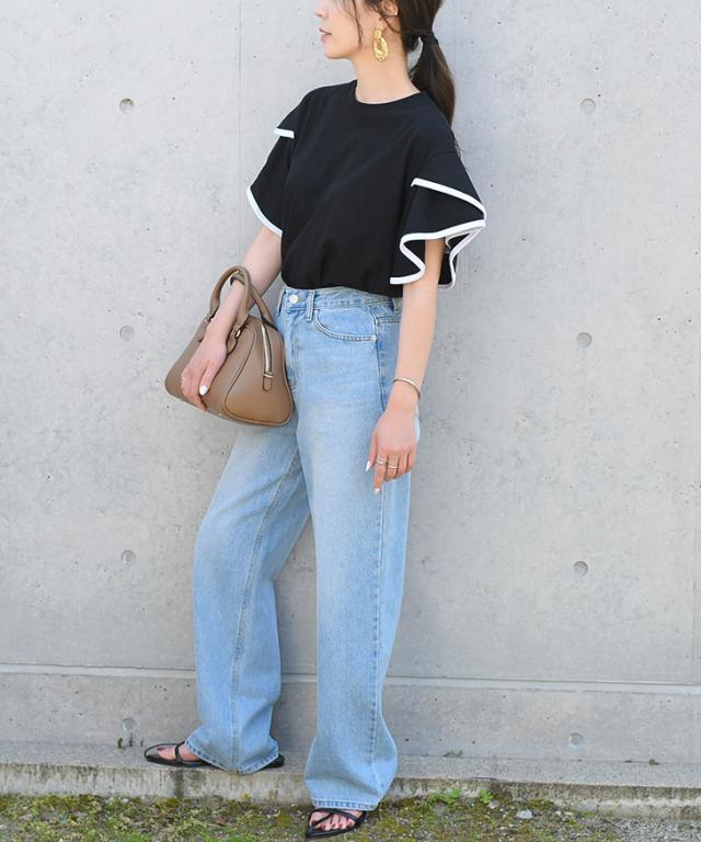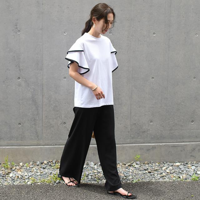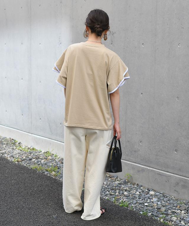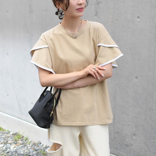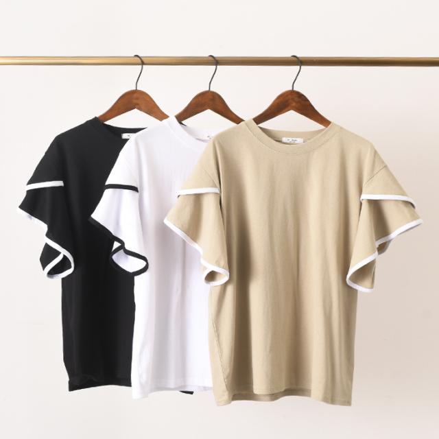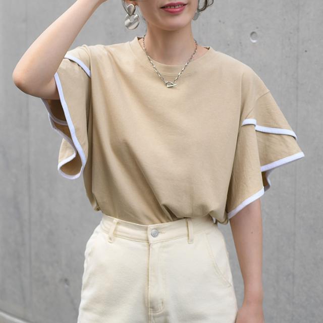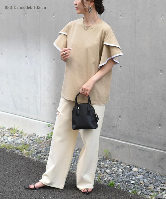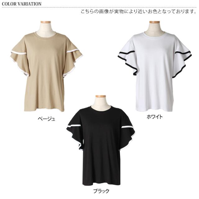 新作 フレアスリーブパイピングベーシックカットソー レディース トップス 半袖 コットン 綿 夏 涼しい バイカラー 配色 フリル かわいい おしゃれ ママ OL オフィス オフィスカジュアル 通勤 通学 着回し