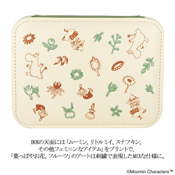 BOXの天面には「ムーミン、リトルミイ、スナフキン、その他フェミニンなアイテム」をプリントで、 「葉っぱやお花、フルーツ」のアートを刺繍で表現したMIXな仕様に。