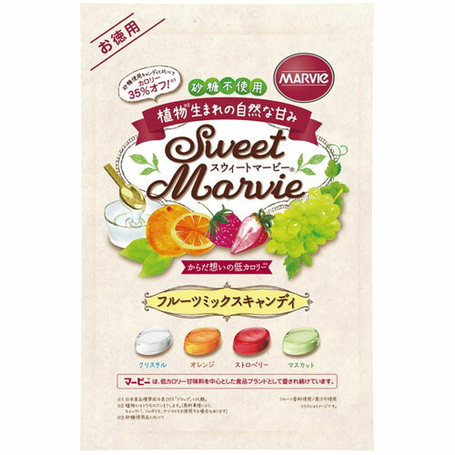 マービー甘味料を使用したキャンディ。クリスタル、オレンジ、ストロベリー、マスカットの4味が1袋に入ったお徳用サイズです。