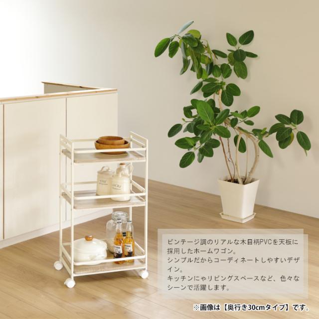 木目をリアルに再現したPVCを使用した天板にシンプルなデザインのスチールフレームを組み合わせたワゴン。