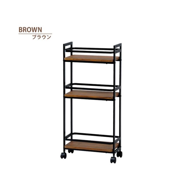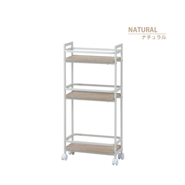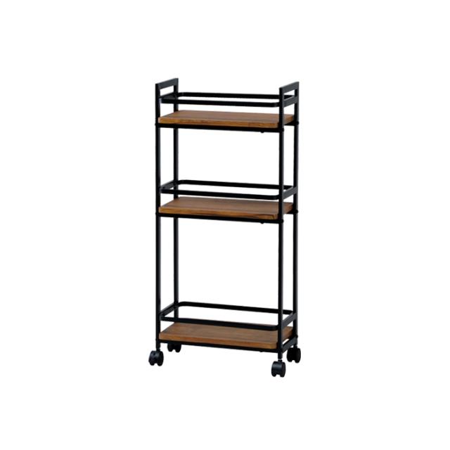 | 木目をリアルに再現したPVCを使用した天板にシンプルなデザインのスチールフレームを組み合わせたワゴン。 ちょっとした隙間にも対応できるスリム仕様。 |