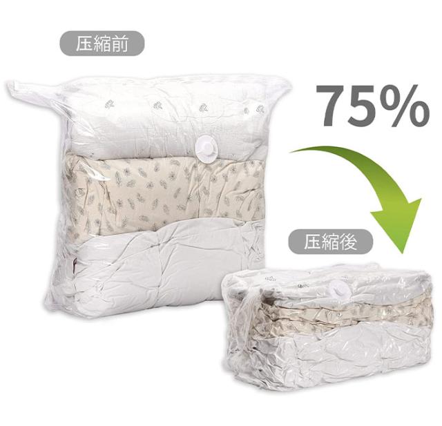 敷布団、枕や大きめの衣類などを一気に収め、最大75%に圧縮してスッキリ収納できます。