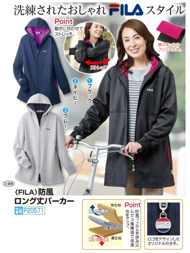 パーカー 長め レディース シニア 秋冬 FILA 防風ロング丈パーカー 全2色 上着 婦人服 ミセス 女性 黒 紺 ブラック ネイビー あったかい 暖かい ナイロンジャケット カジュアル フィラ スポーティ 防寒 ファッション オシャレ 50代 60代 70代 80代 fri p20571