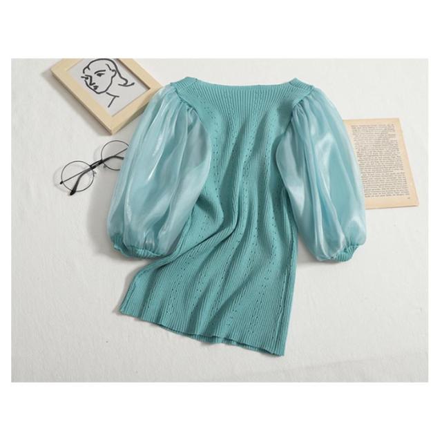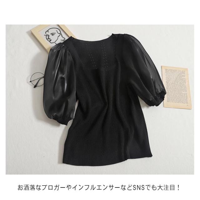| シースルーの袖が涼しげなフェミニンテイストのトップス。 腕をスッキリ見せてくれるフパフ袖にシースルー素材で涼しげで女性らしく。 サマーニットで着心地は抜群です! お洒落なブロガーやインフルエンサーなどSNSでも大注目! | |