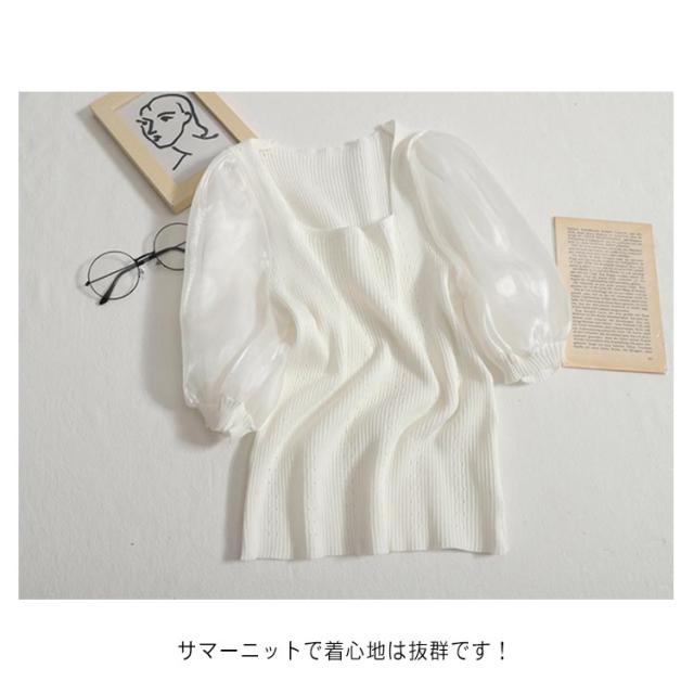送料無料 フリル袖 サマーニット トップス シースルー袖 シースルー ニット パフスリーブ 透け感 韓国 ファッション トップス ニット プルオーバー シアー カジュアル シンプル かわいい 夏 春秋