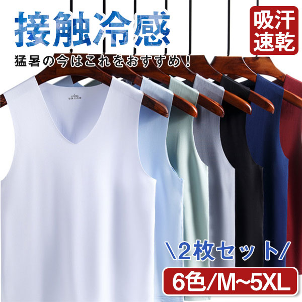 タンクトップ メンズ インナー トップス ノースリーブ ひんやり 涼しい 接触冷感 Vネック クールビズ 汗対策 下着 2点セット