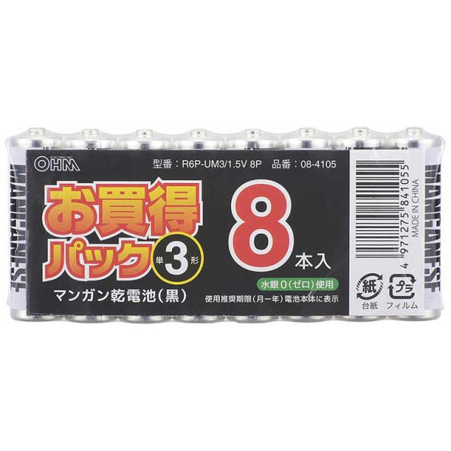 オーム電機 単3乾電池 [マンガン/8本] R6P-UM3/1.5V8P