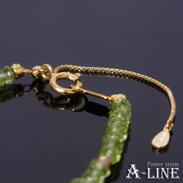 ペリドット・ボタンカット4mm、ヘマタイト・ファセット(コーティング)金色、SILVER925ひき輪&スライドアジャスター金色、形状記憶超弾性ワイヤー、ワンプッシュ